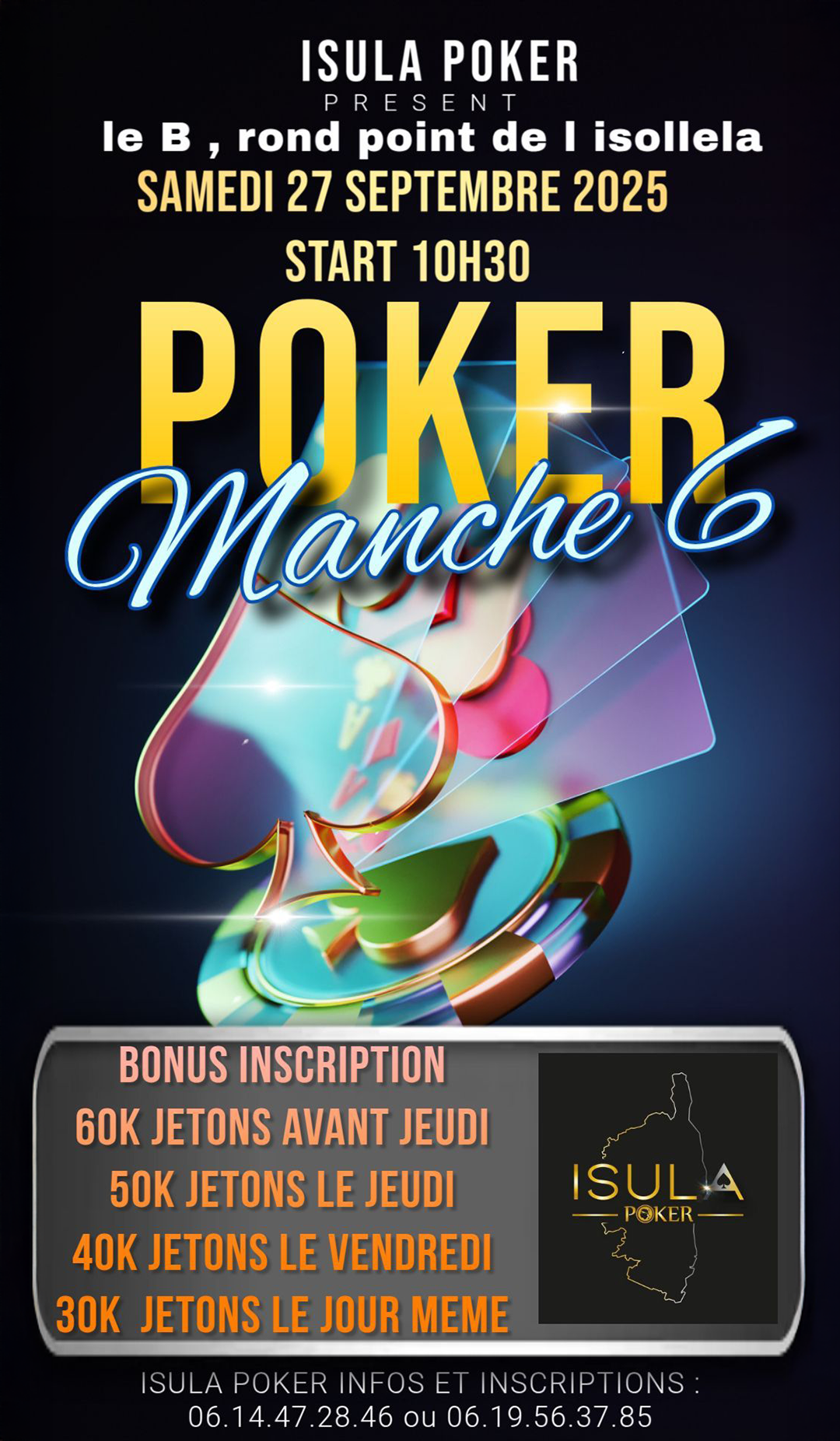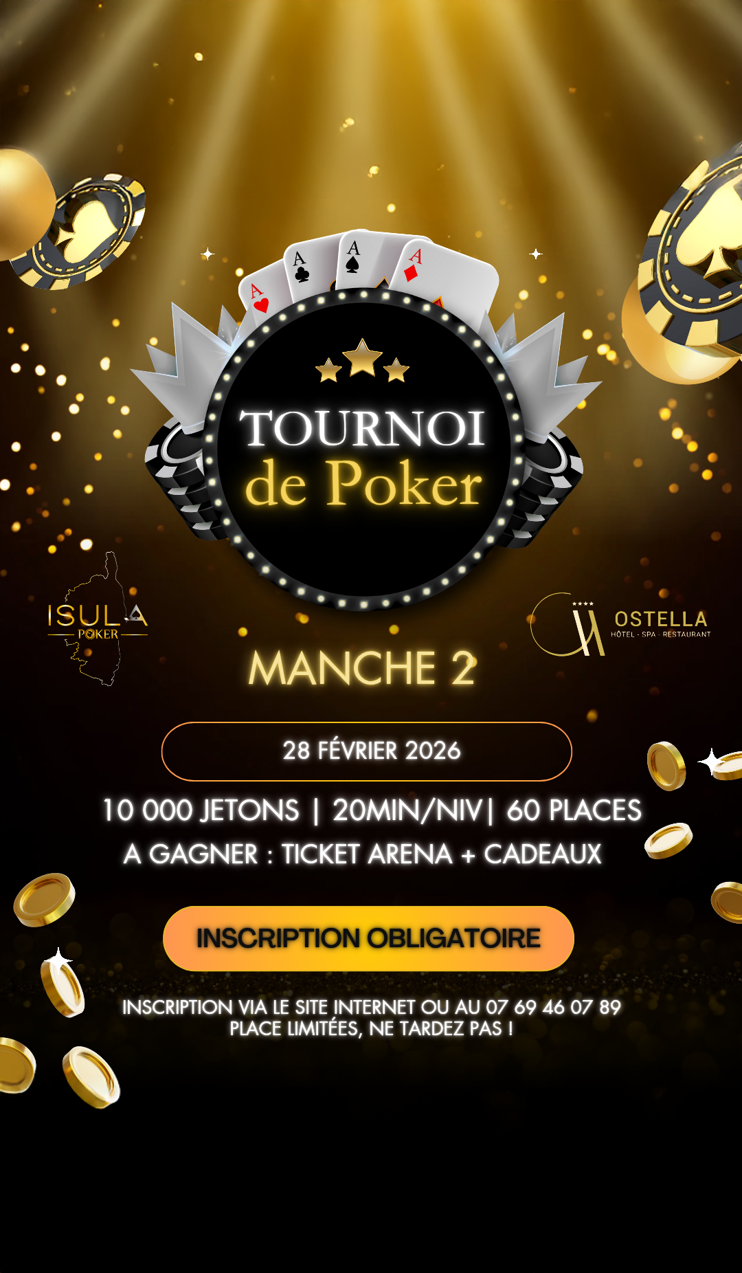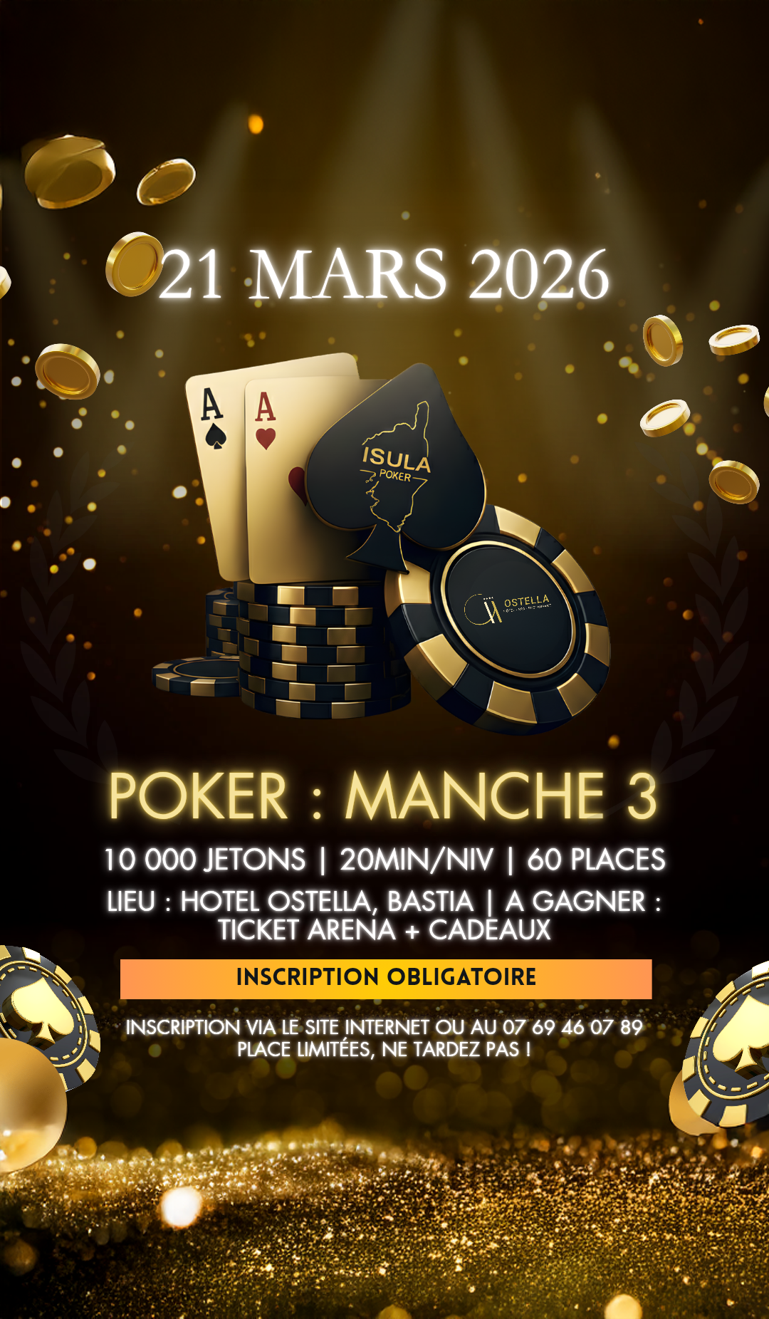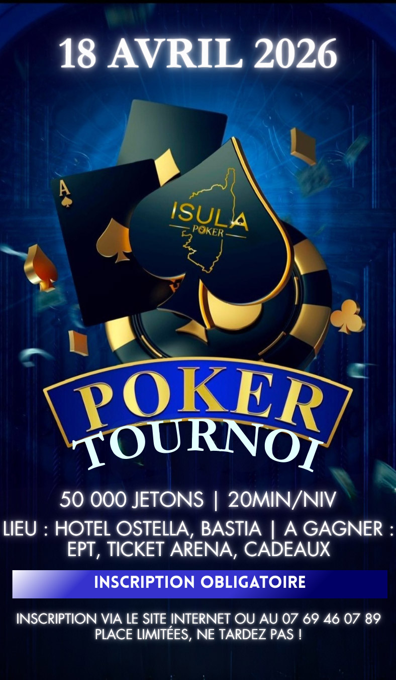 ISULA POKER vous propose de jouer au plus proche de chez vous si vous êtes du coté d’AJACCIO, Alexandre se seras ravis de vous accueillir. Vous habitez prés de BASTIA, François et Myriam se seront ravis de vous compter parmi leurs adhérents. Peu importe l’endroit ou vous allez jouer une fois par an nous retrouverons pour un Super tournois Caritatif. Nos Sponsors vous permettrez de gagner des tickets FPS (valeur 1100€) POKERSTARS et bien plus encore. Tout au long de l’année vous pouvez jouer de chez vous en inscrivant sur le site de pokerstars et de participer au tournois d’isula poker (pas besoins d’etre adhérents du club pour jouer en online mais il faut disposer d’un compte pokerstars)